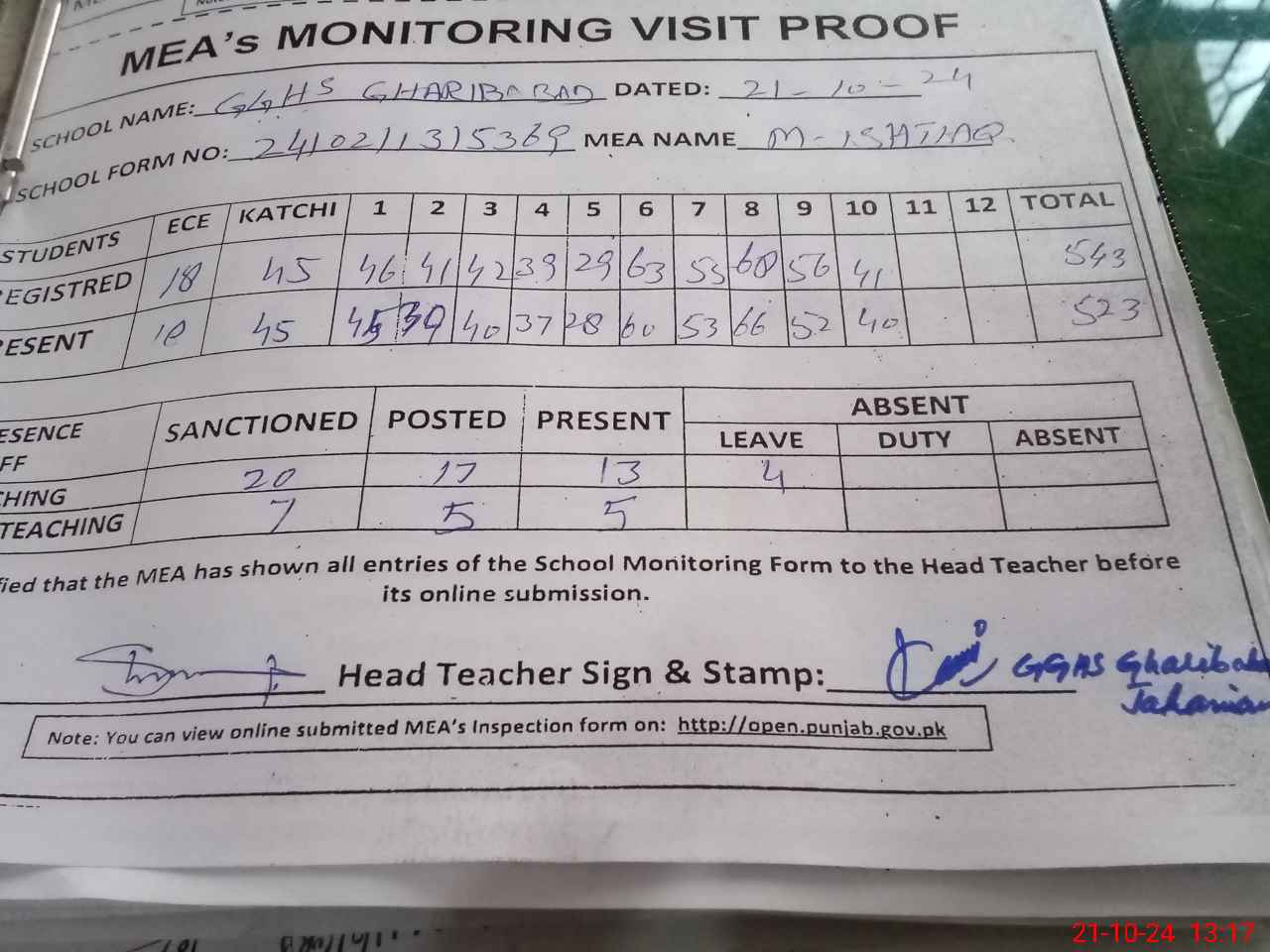 | Attendance Register | Head Teacher | MEA with School | Visit Proof |