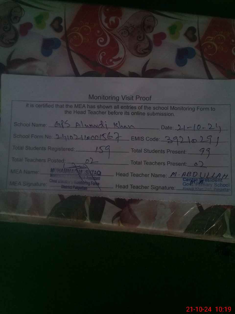 | EMIS Code: 39210291 | Name of School: GPS ALWARDI KHAN | |||