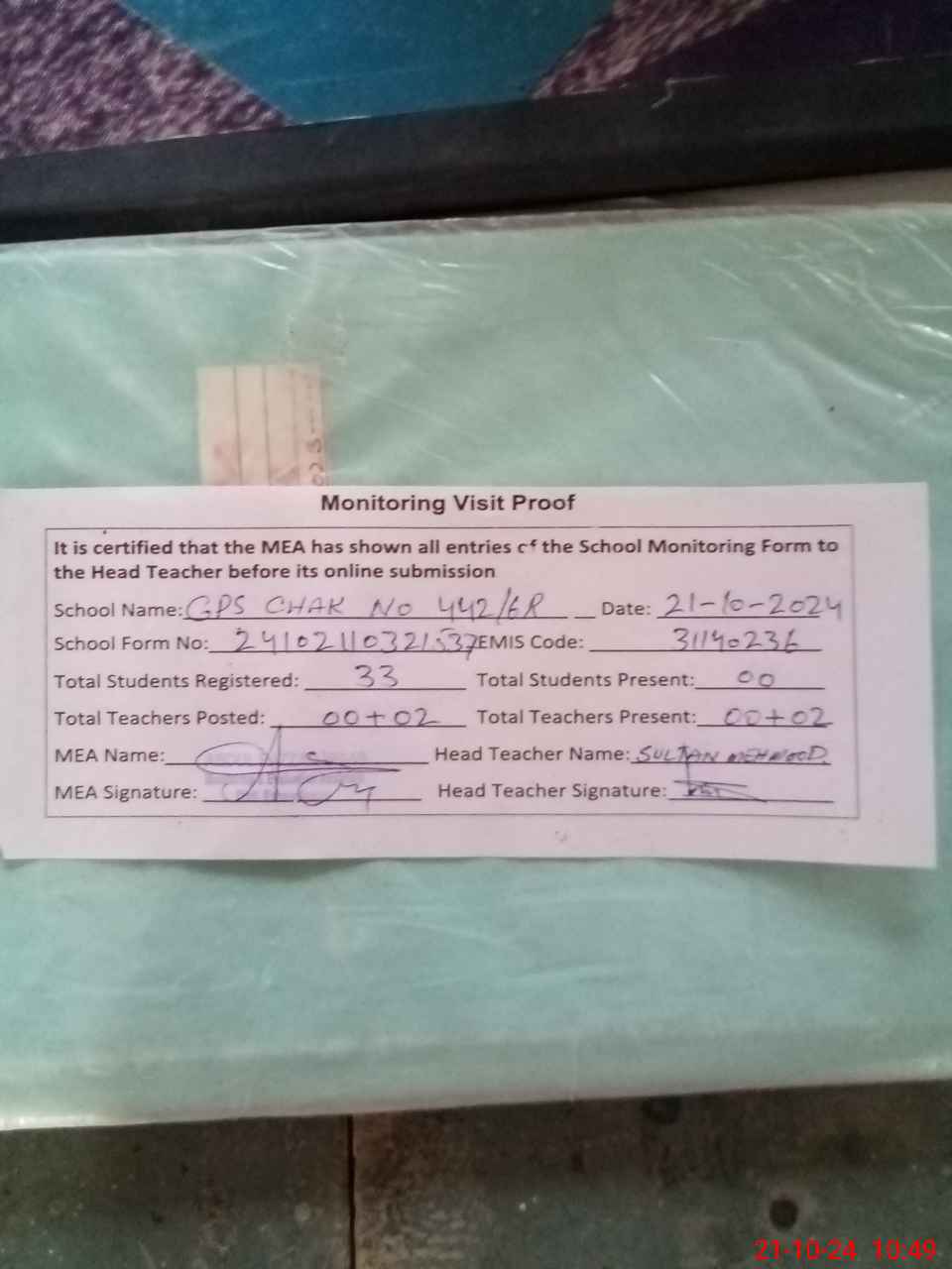 | EMIS Code: 31140236 | Name of School: GPS CHAK NO 442/6-R | |||