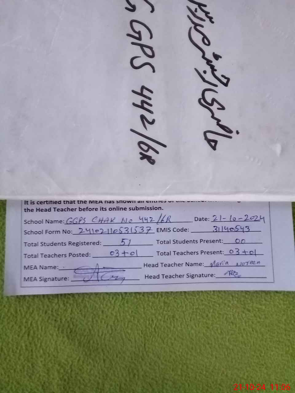| EMIS Code: 31140543 | Name of School: GGPS CHAK NO. 442/6-R | |||