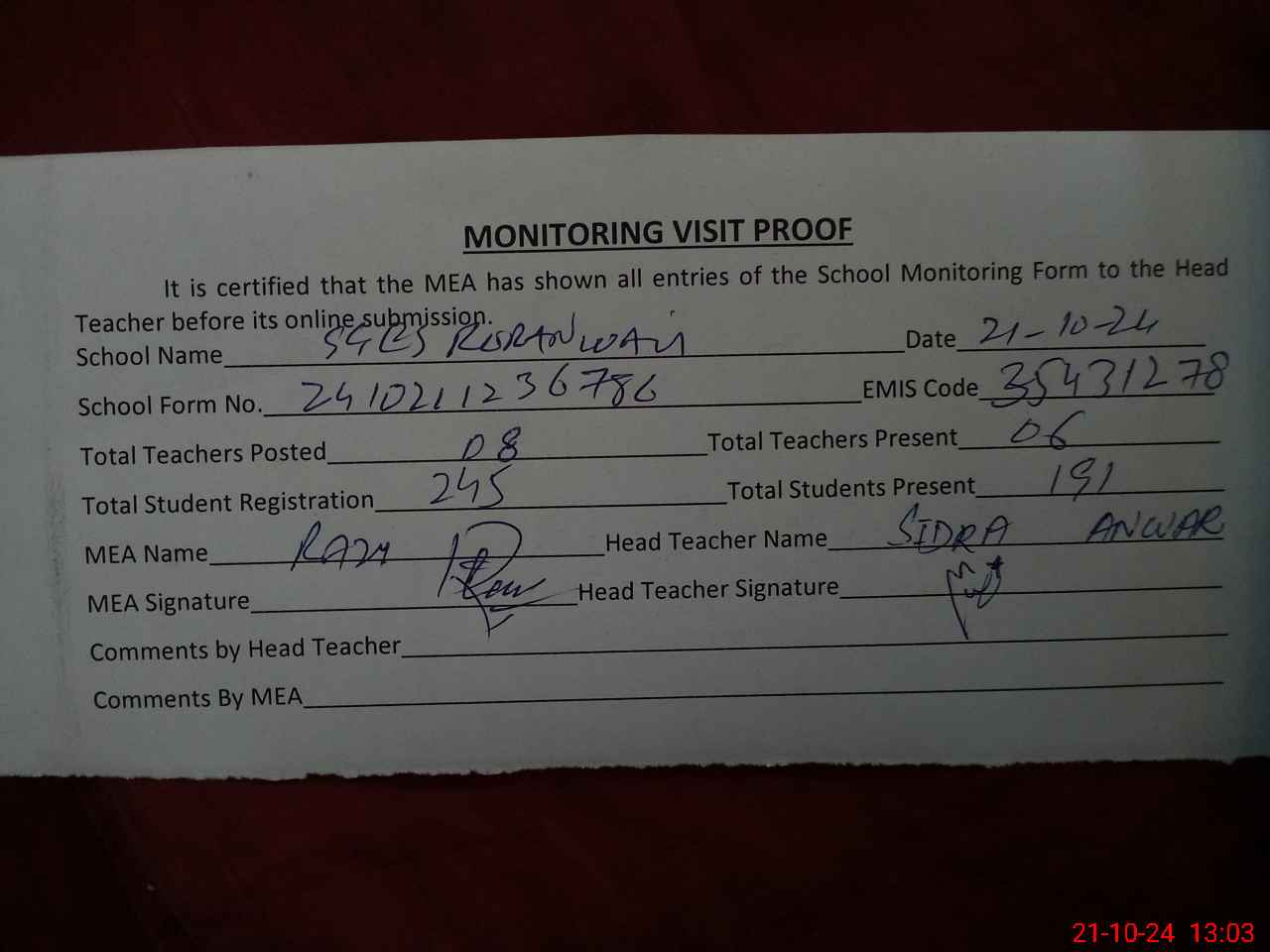 | Attendance Register | Head Teacher | MEA with School | Visit Proof |