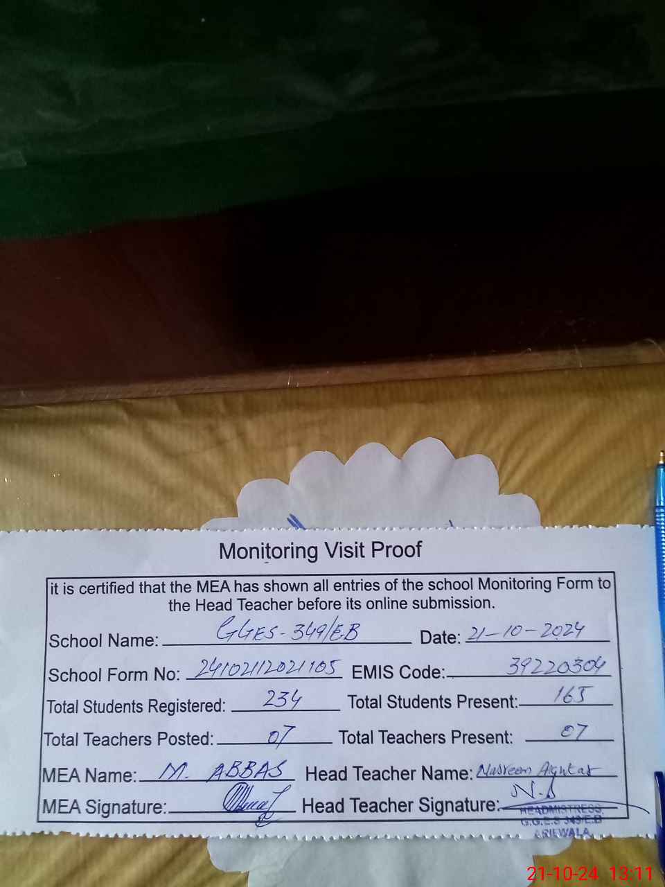 | EMIS Code: 39220304 | Name of School: GGES 349 EB POST OFFICE chak 157/EB | |||