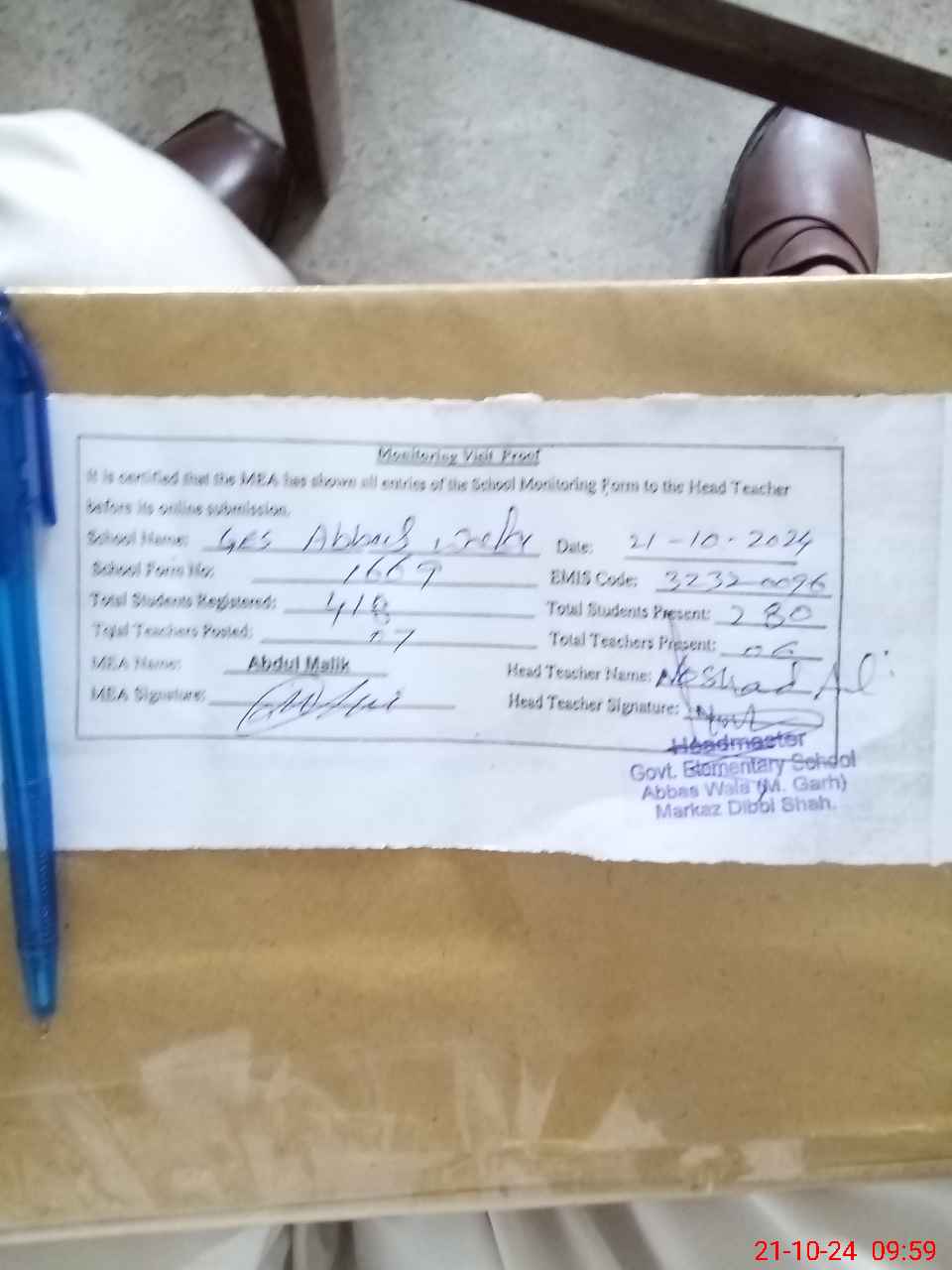 | Certified that this School was Inspected by the Undersigned MEA/DMO Today and the Information Stated Above is as Per Record. | |||||