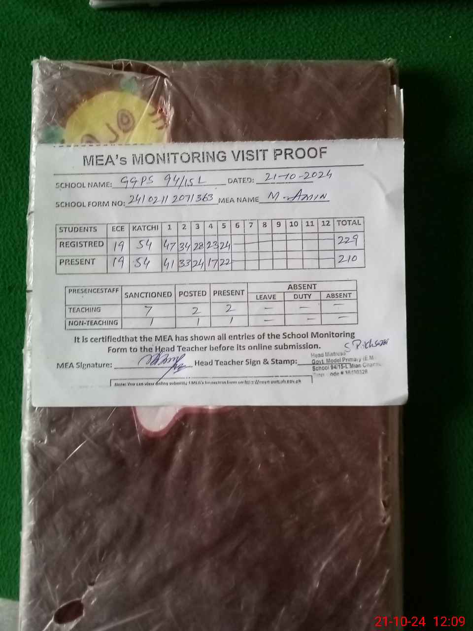 | Attendance Register | Head Teacher | MEA with School | Visit Proof |