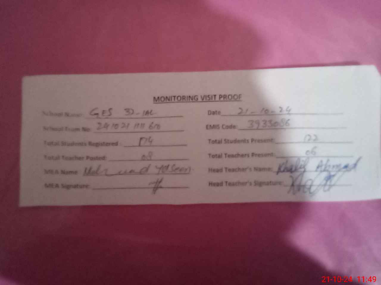 | Attendance Register | Head Teacher | MEA with School | Visit Proof |