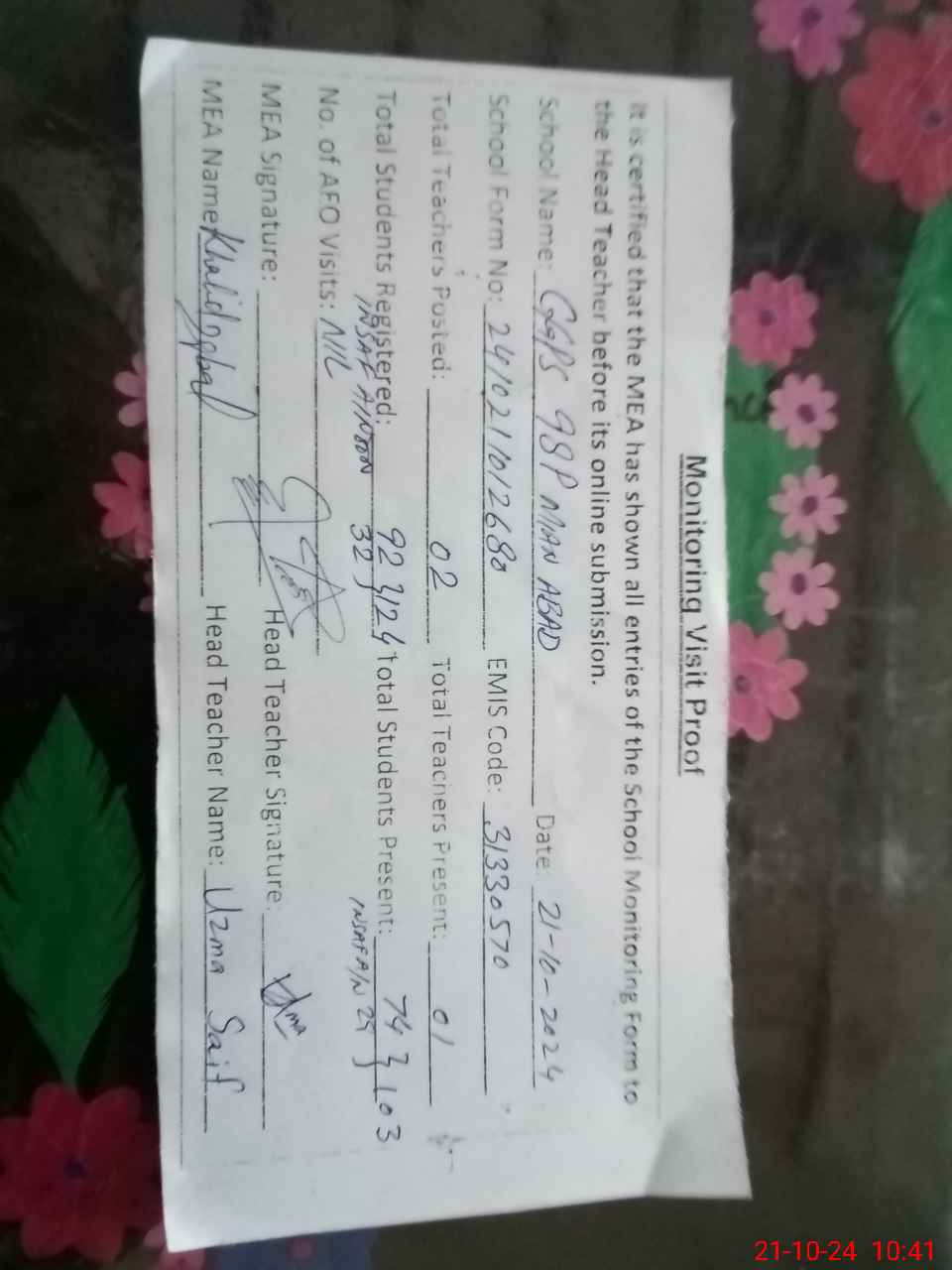| Remarks (Use Separate Page if Required): Class verification is not updated on mea tab as per sis and school has insaf afternoon classes with students strength 32 | |||||