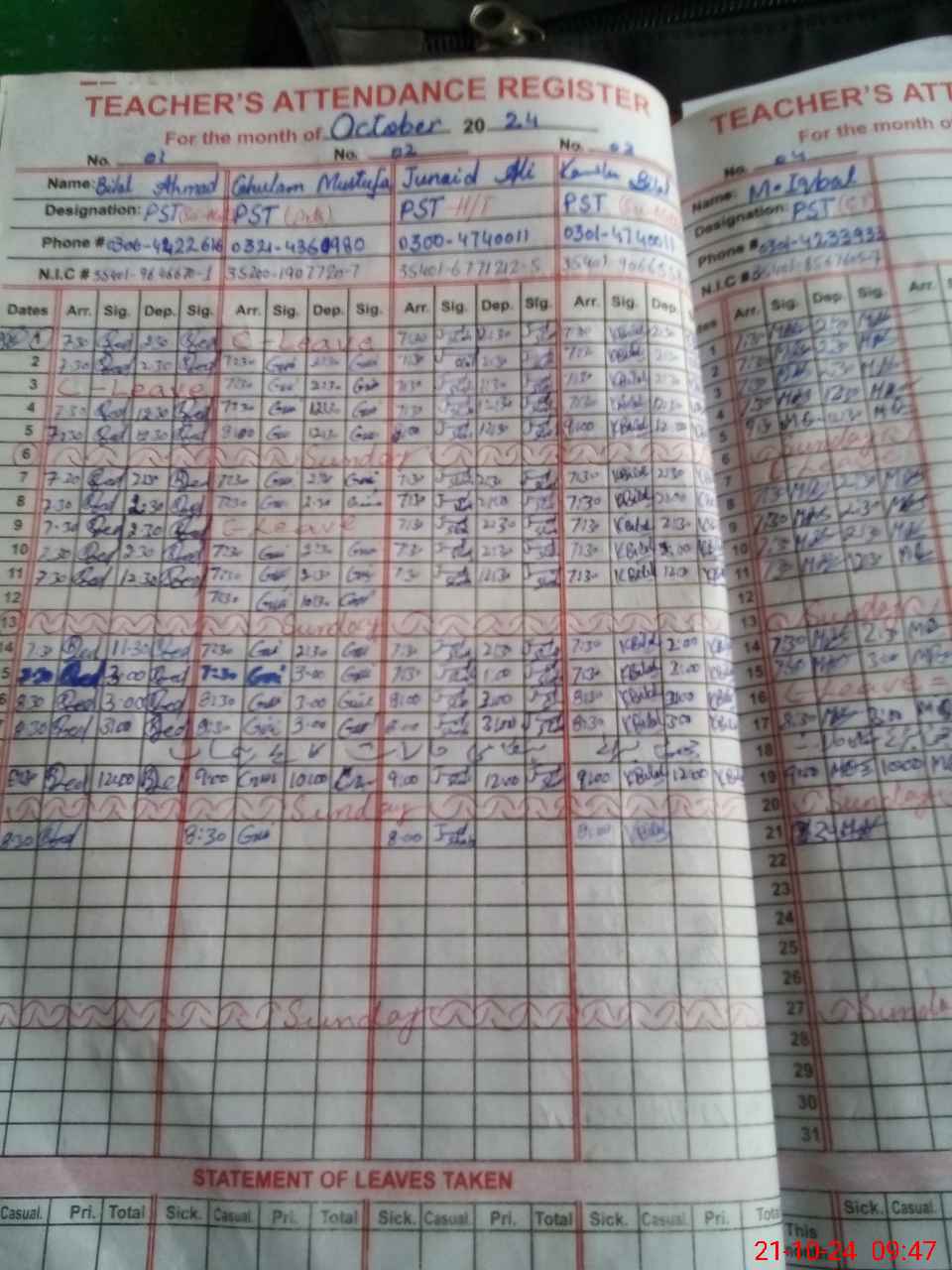 | CNIC | Full Name | Designation | R/C | Absence during last cal. month |