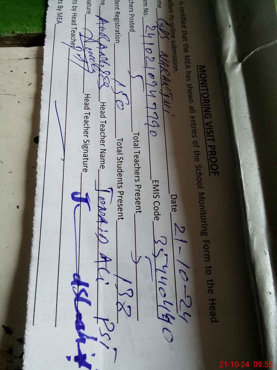 | Attendance Register | Head Teacher | MEA with School | Visit Proof |