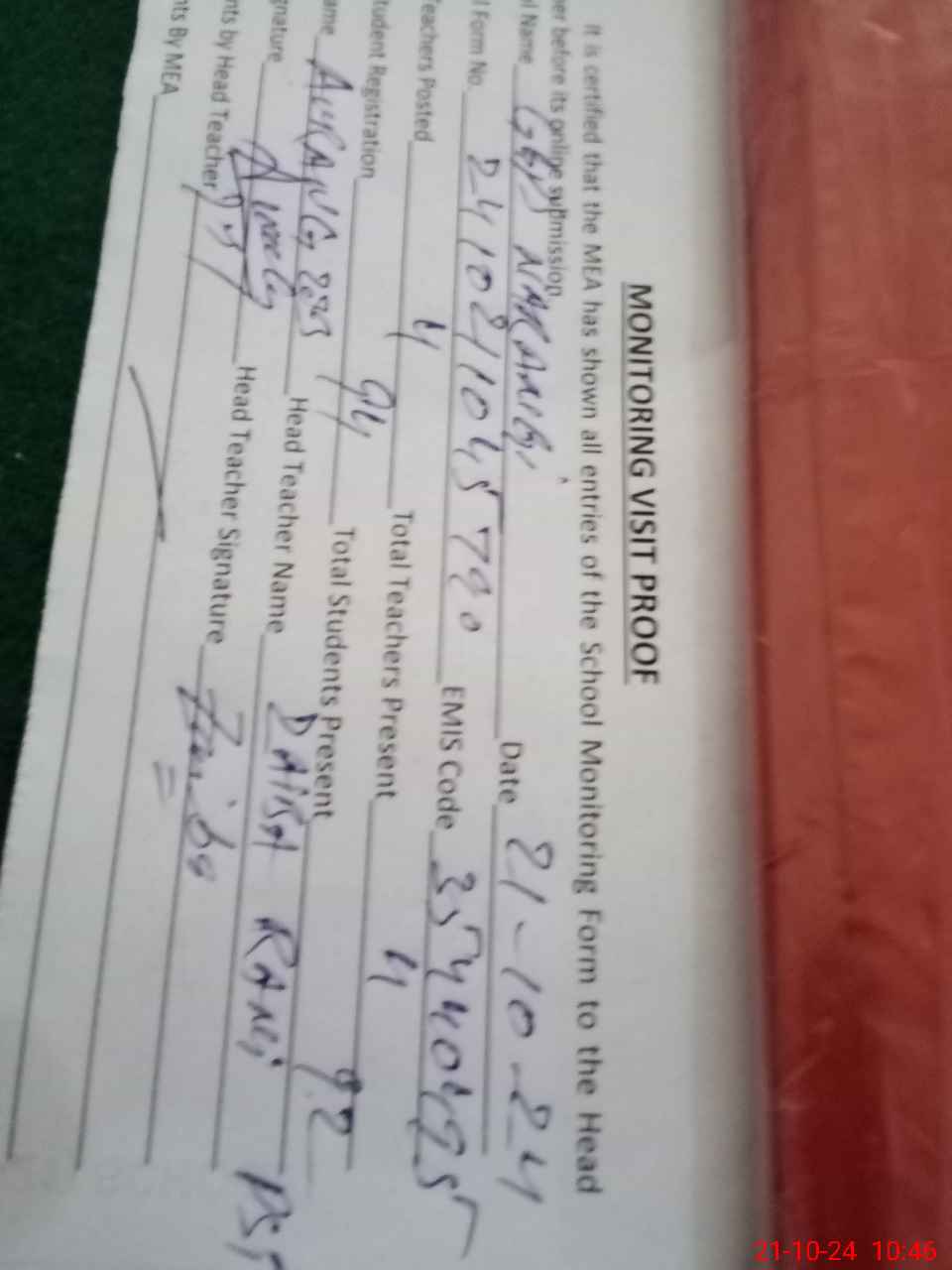 | Attendance Register | Head Teacher | MEA with School | Visit Proof |