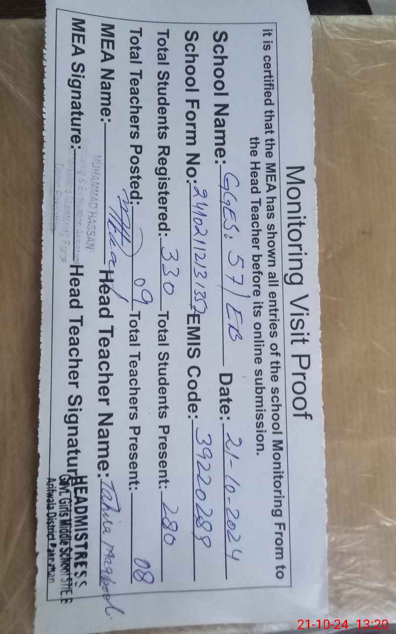 | Certified that this School was Inspected by the Undersigned MEA/DMO Today and the Information Stated Above is as Per Record. | |||||