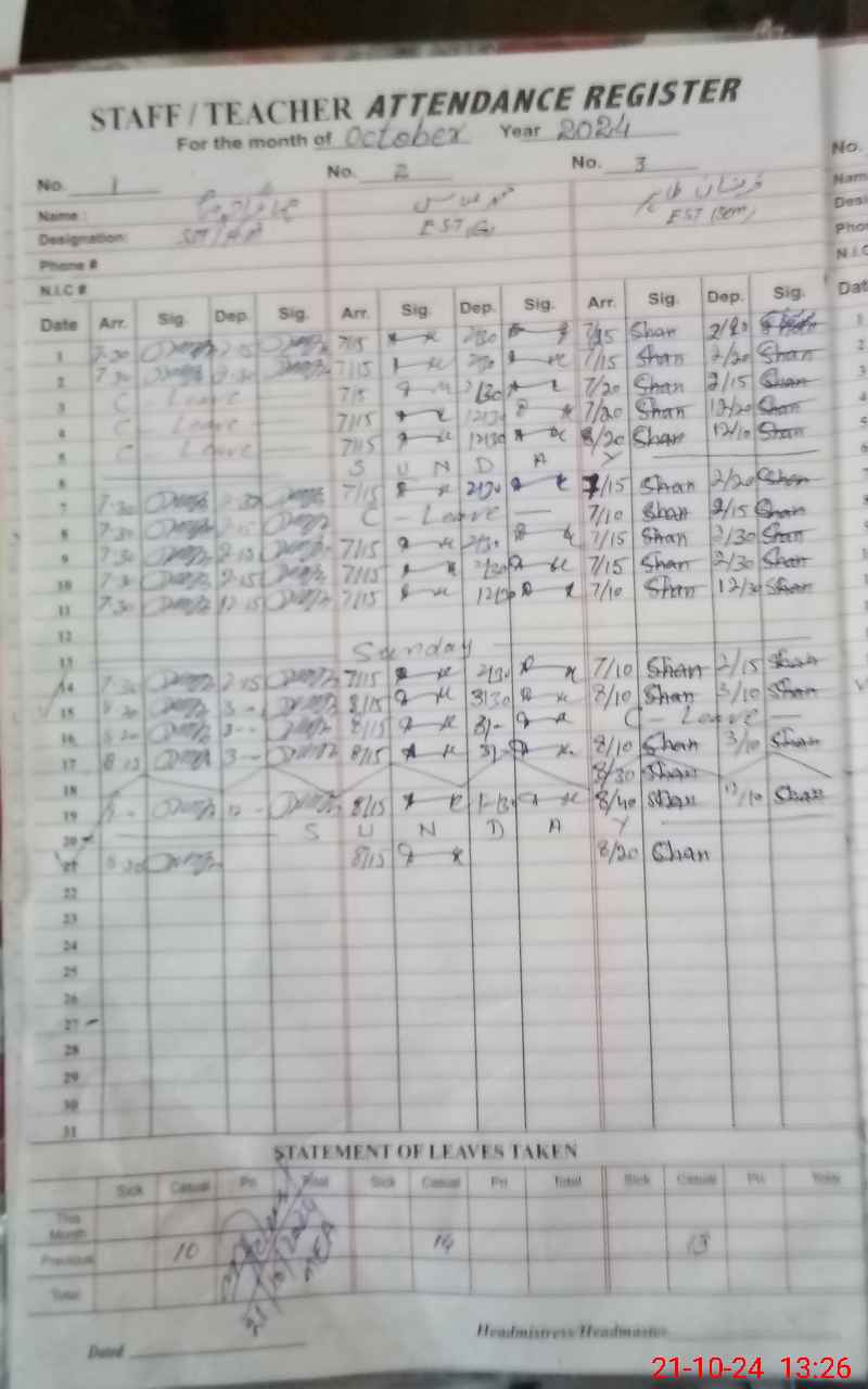 | CNIC | Full Name | Designation | R/C | Absence During Last Calender Month |