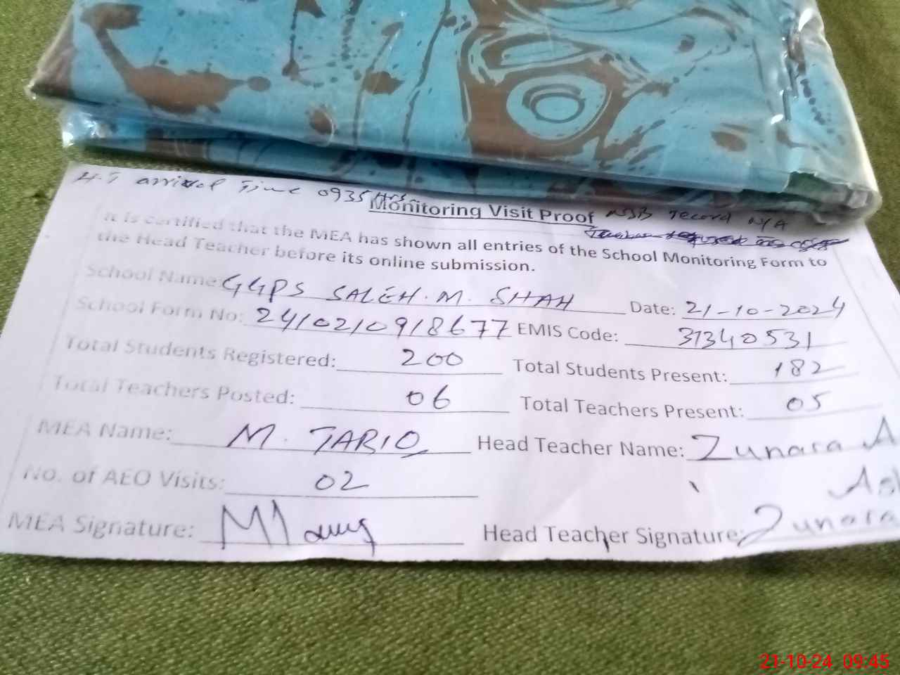 | Attendance Register | Head Teacher | MEA with School | Visit Proof |