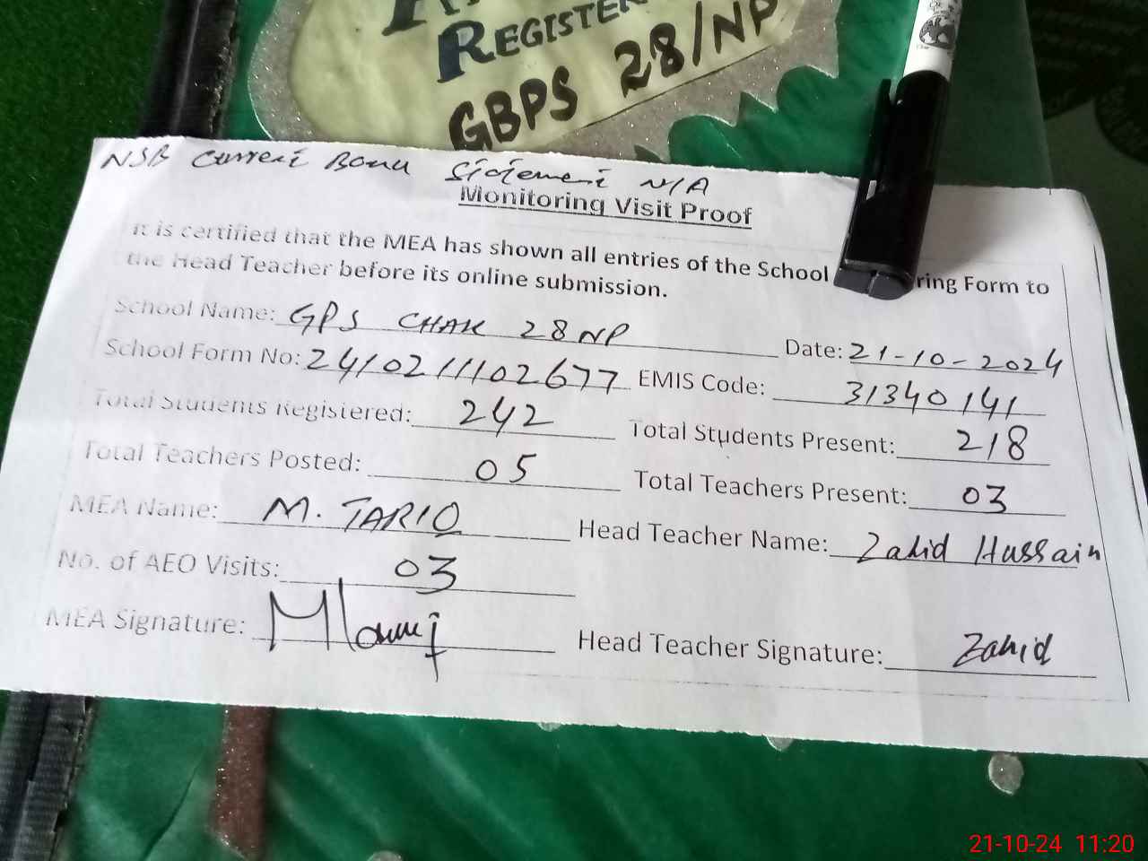 | Attendance Register | Head Teacher | MEA with School | Visit Proof |
