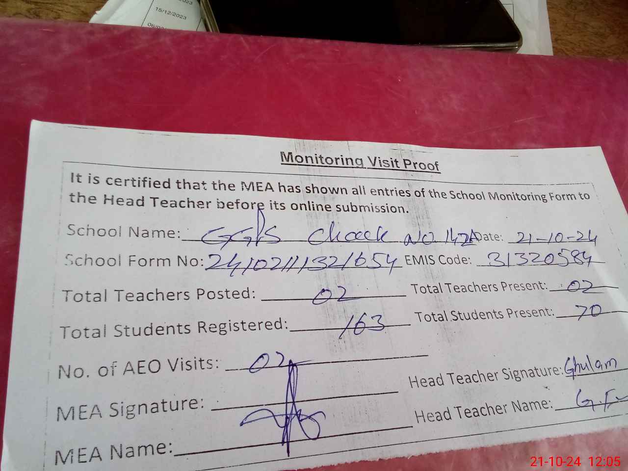 | Attendance Register | Head Teacher | MEA with School | Visit Proof |
