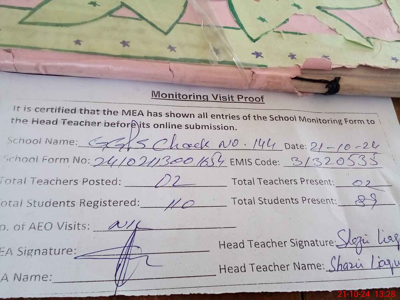 | Attendance Register | Head Teacher | MEA with School | Visit Proof |