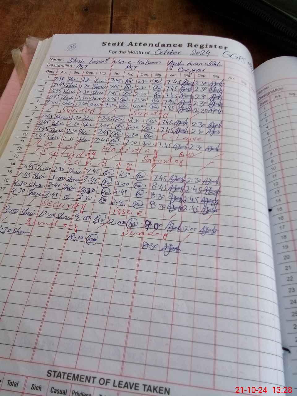| Leave | Duty | Absent | Maternity | Medical | Ex- Pak |