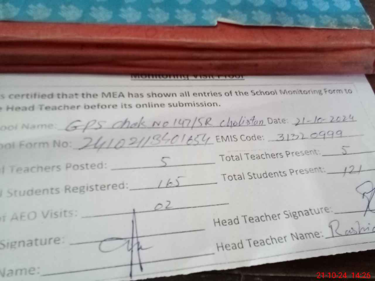 | Attendance Register | Head Teacher | MEA with School | Visit Proof |