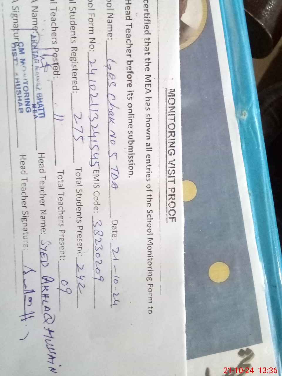 | EMIS Code: 38230209 | Name of School: GES CHAK NO. 5 TDA | |||