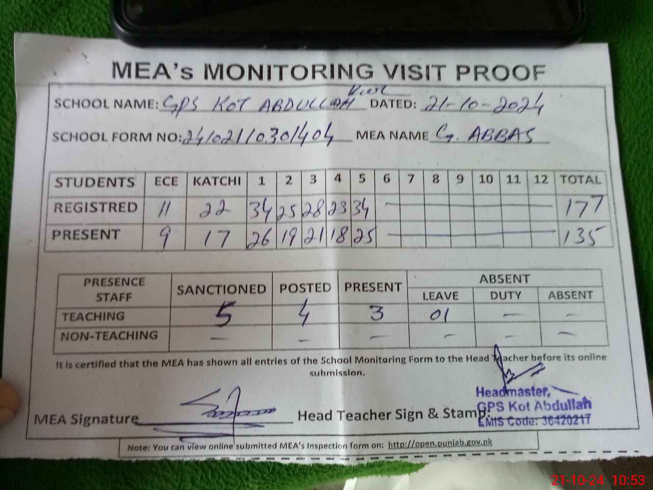 | EMIS Code: 36420217 | Name of School: GPS KOT ABDULLAH, P/O MAKHDOOM PUR, KHANEWAL | |||