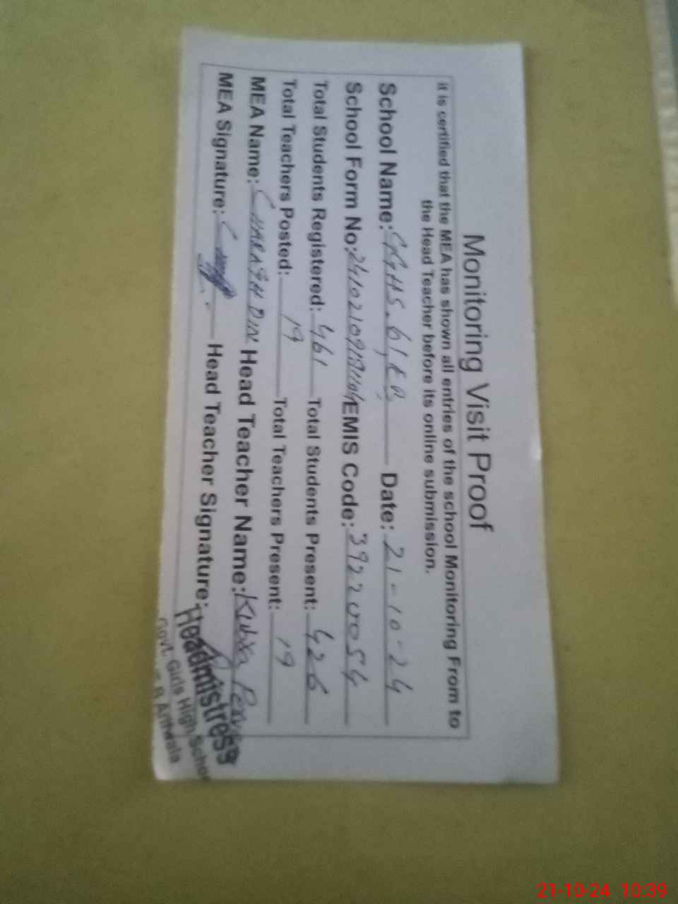 | EMIS Code: 39220054 | Name of School: GGHS 61 EB | |||