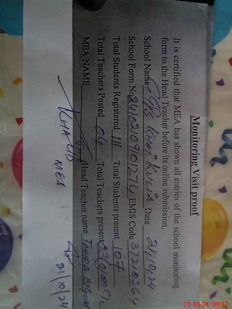 | Monitoring Date: 21-10-2024 | Start Time: 21-10-2024 08:45 AM | End Time: 21-10-2024 09:22 AM | Name of MEA: KH**** ME**** | |