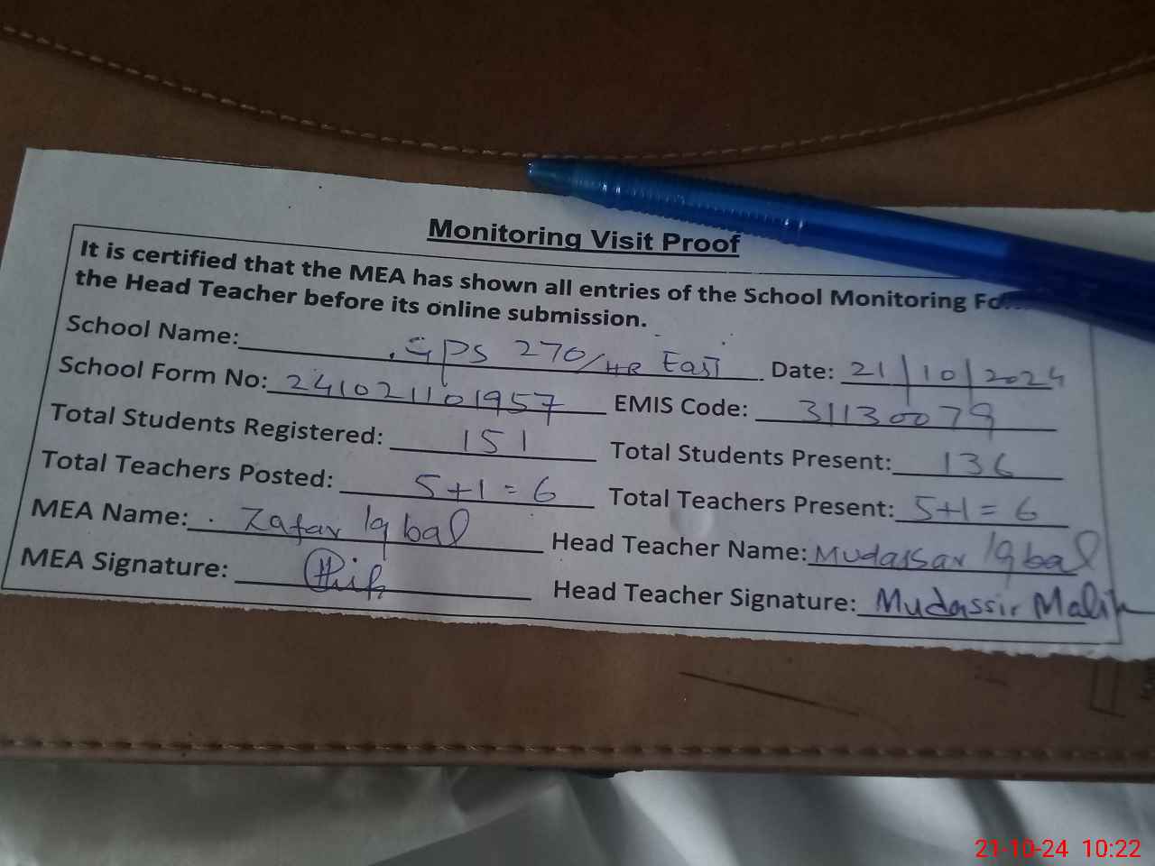 | Attendance Register | Head Teacher | MEA with School | Visit Proof |