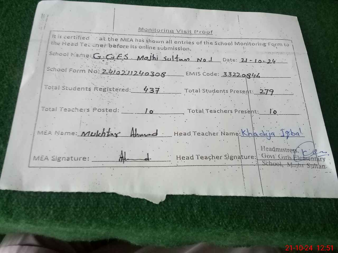 | Certified that this School was Inspected by the Undersigned MEA/DMO Today and the Information Stated Above is as Per Record. | |||||