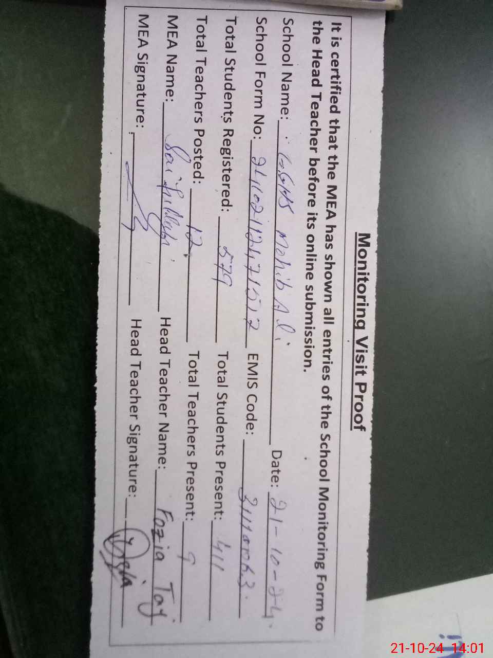 | Certified that this School was Inspected by the Undersigned MEA/DMO Today and the Information Stated Above is as Per Record. | |||||