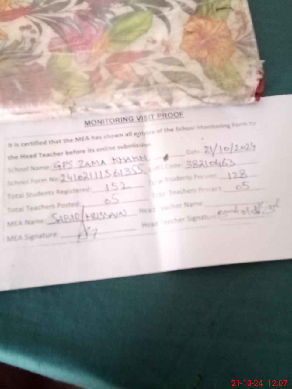 | Certified that this School was Inspected by the Undersigned MEA/DMO Today and the Information Stated Above is as Per Record. | |||||