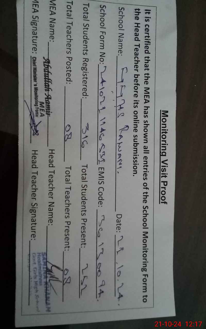 | EMIS Code: 36130094 | Name of School: GGHS RAWANI MULTAN | |||