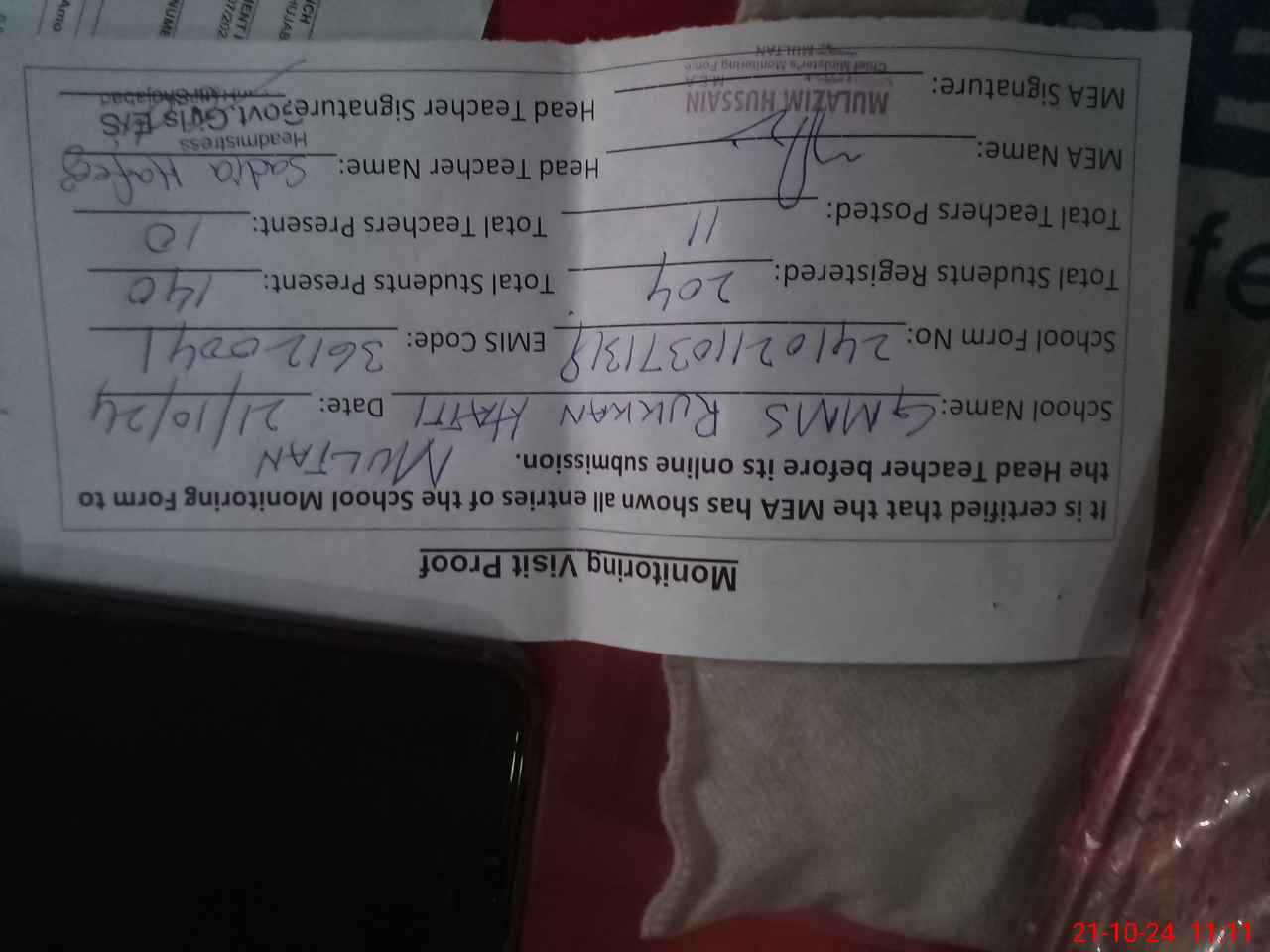| Name: SA**** HA**** Designation: (School Headmaster's/Headmistress's) HEADMISSTRESS Phone/Cell Number: 03**** |