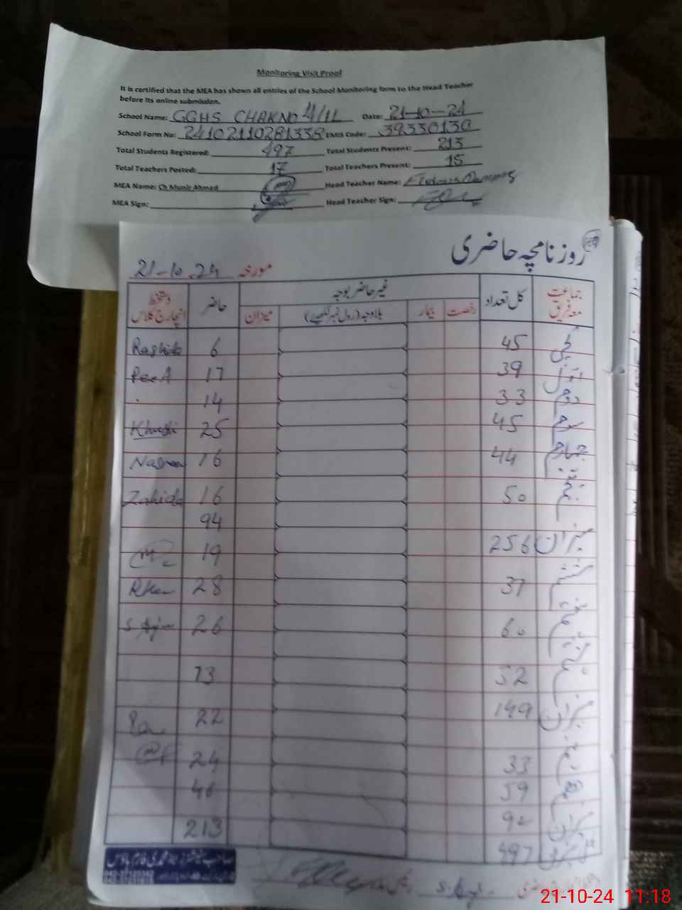 | Attendance Register | Head Teacher | MEA with School | Visit Proof |