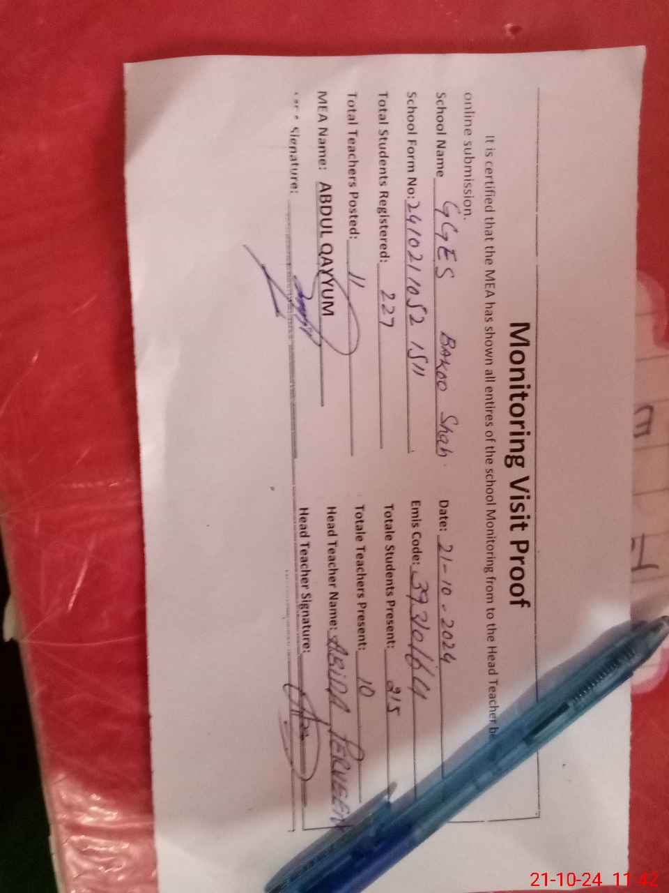 | Attendance Register | Head Teacher | MEA with School | Visit Proof |