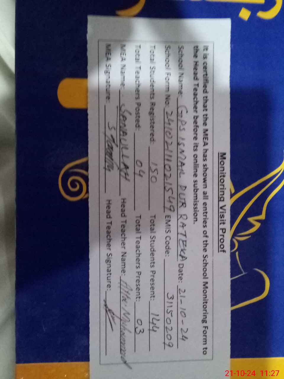 | Attendance Register | Head Teacher | MEA with School | Visit Proof |