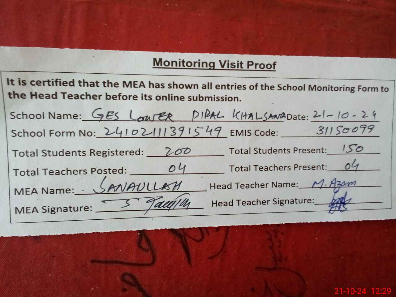 | Certified that this School was Inspected by the Undersigned MEA/DMO Today and the Information Stated Above is as Per Record. | |||||