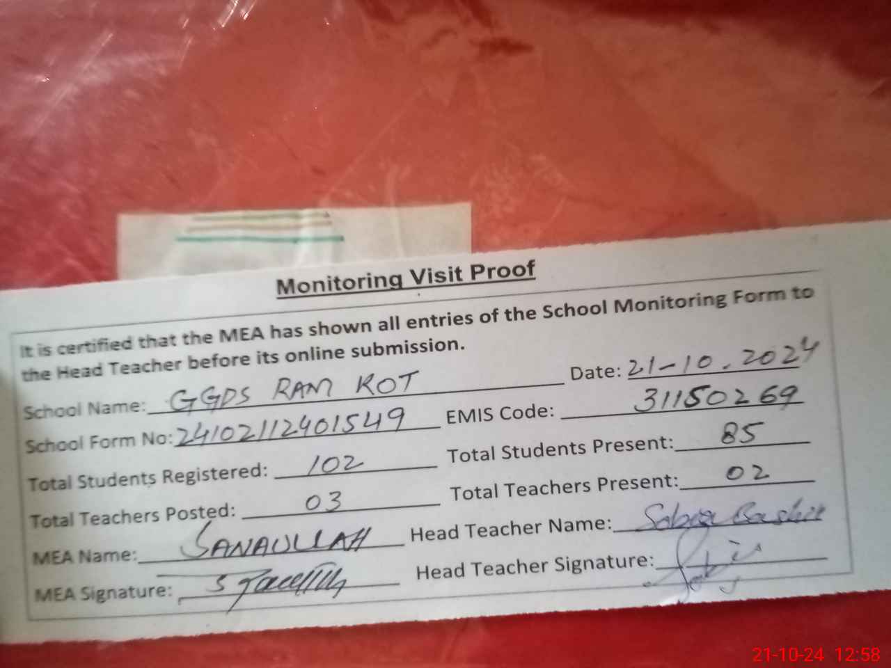 | Attendance Register | Head Teacher | MEA with School | Visit Proof |