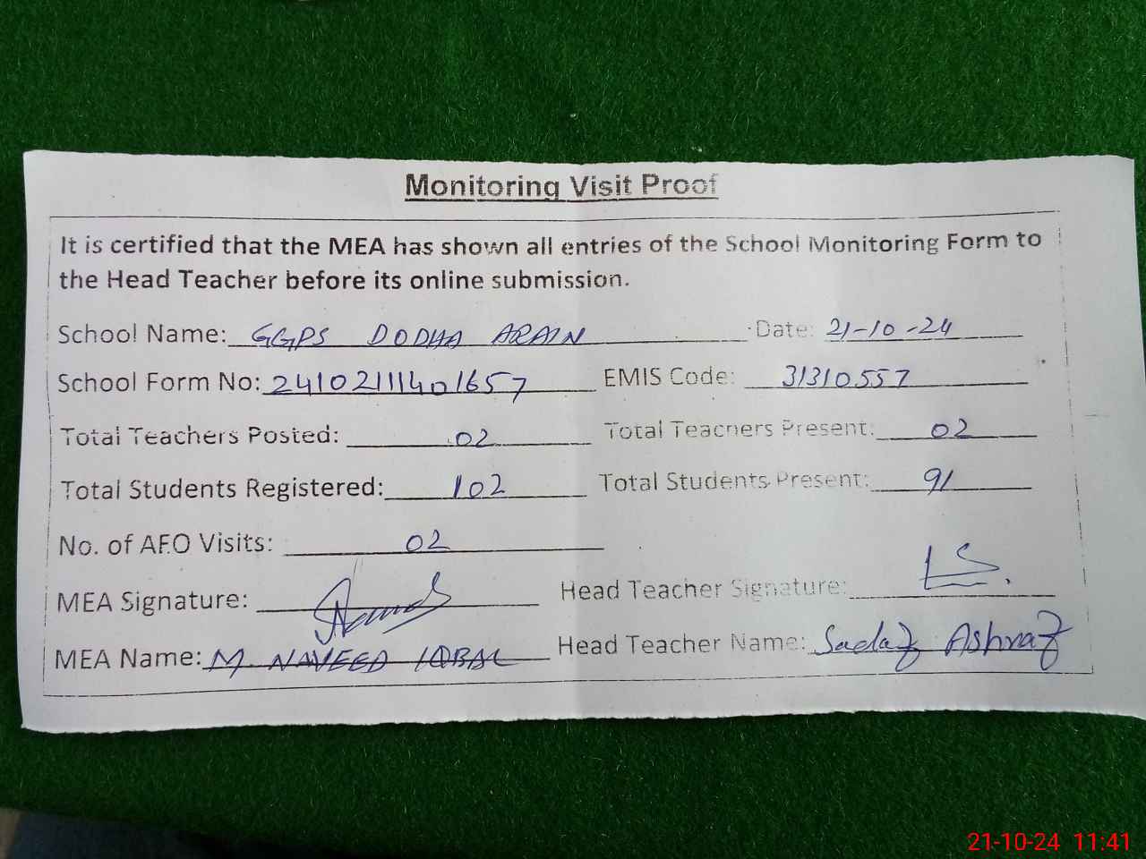 | EMIS Code: 31310557 | Name of School: GGPS DODAH ARIAN | |||