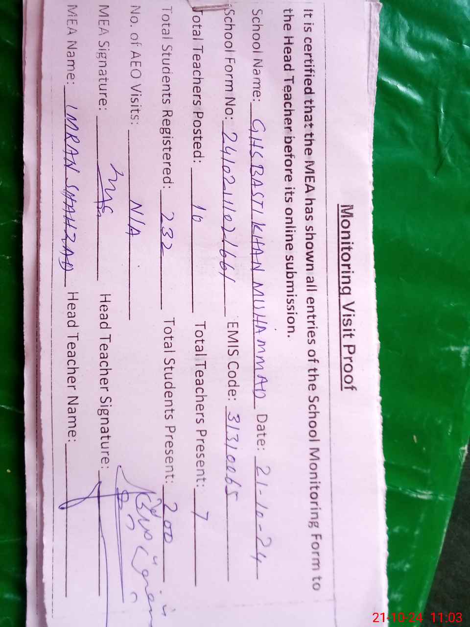 | EMIS Code: 31310065 | Name of School: GHS BASTI KHAN MUHAMMAD | |||