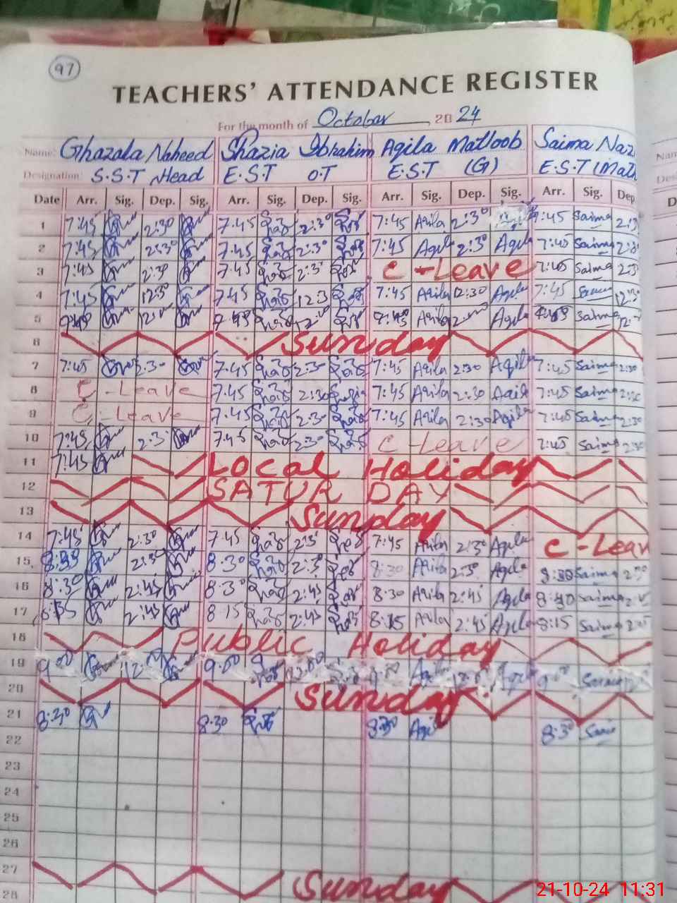 | Leave | Duty | Absent | Maternity | Medical | Ex- Pak |
