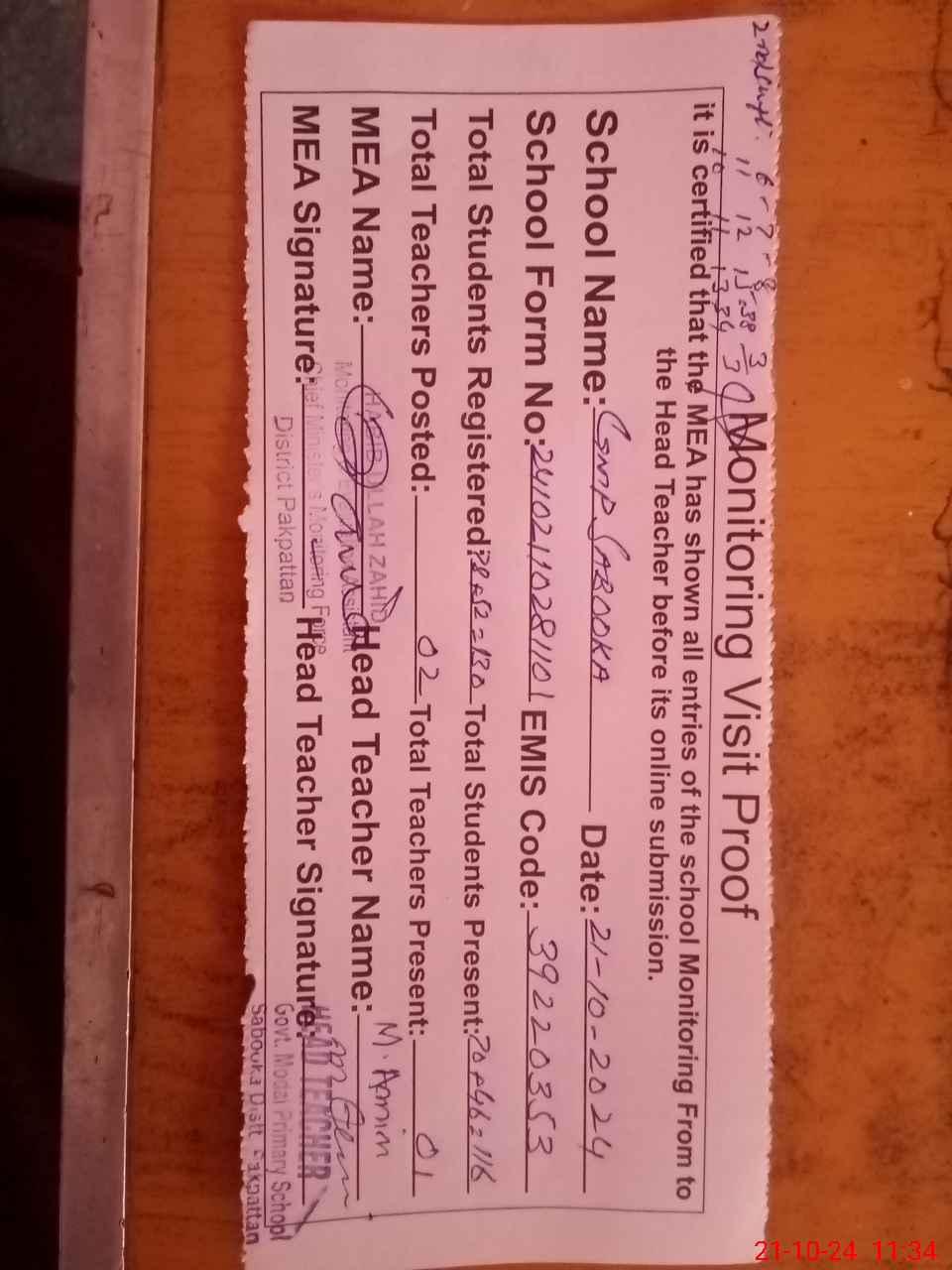 | Certified that this School was Inspected by the Undersigned MEA/DMO Today and the Information Stated Above is as Per Record. | |||||