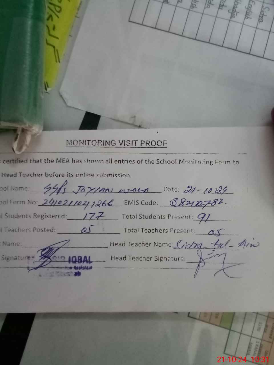 | EMIS Code: 38210782 | Name of School: GGPS JOIYAN WALA | |||