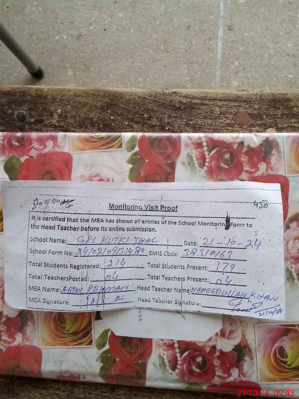 | Certified that this School was Inspected by the Undersigned MEA/DMO Today and the Information Stated Above is as Per Record. | |||||