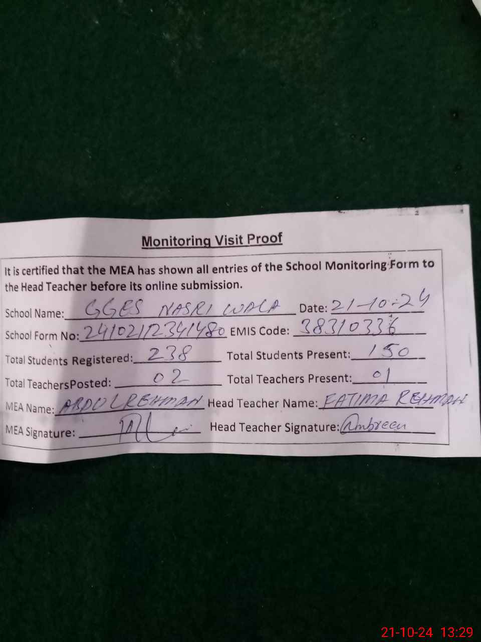 | Attendance Register | Head Teacher | MEA with School | Visit Proof |