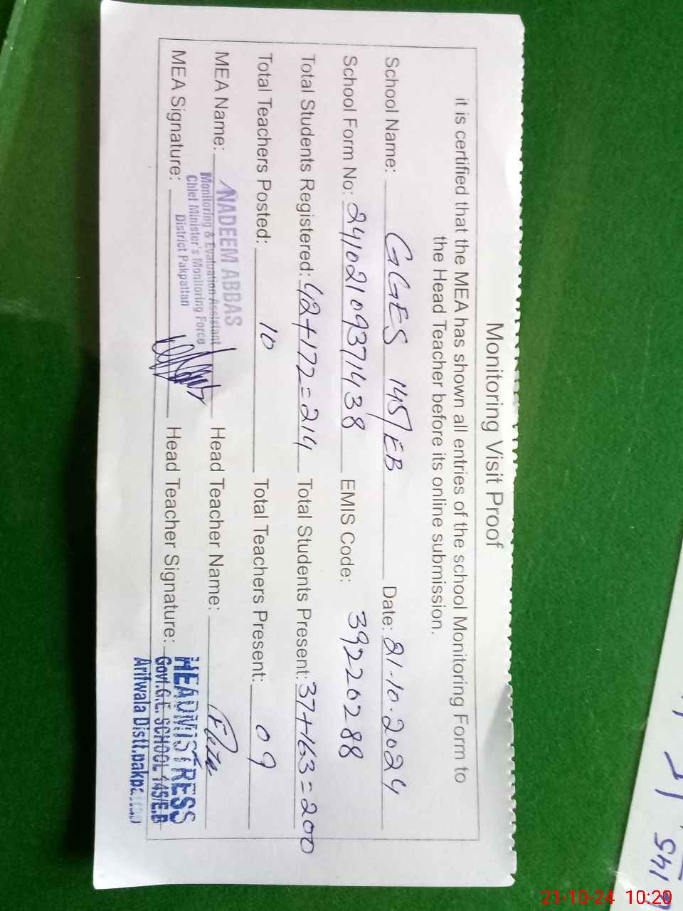 | Certified that this School was Inspected by the Undersigned MEA/DMO Today and the Information Stated Above is as Per Record. | |||||