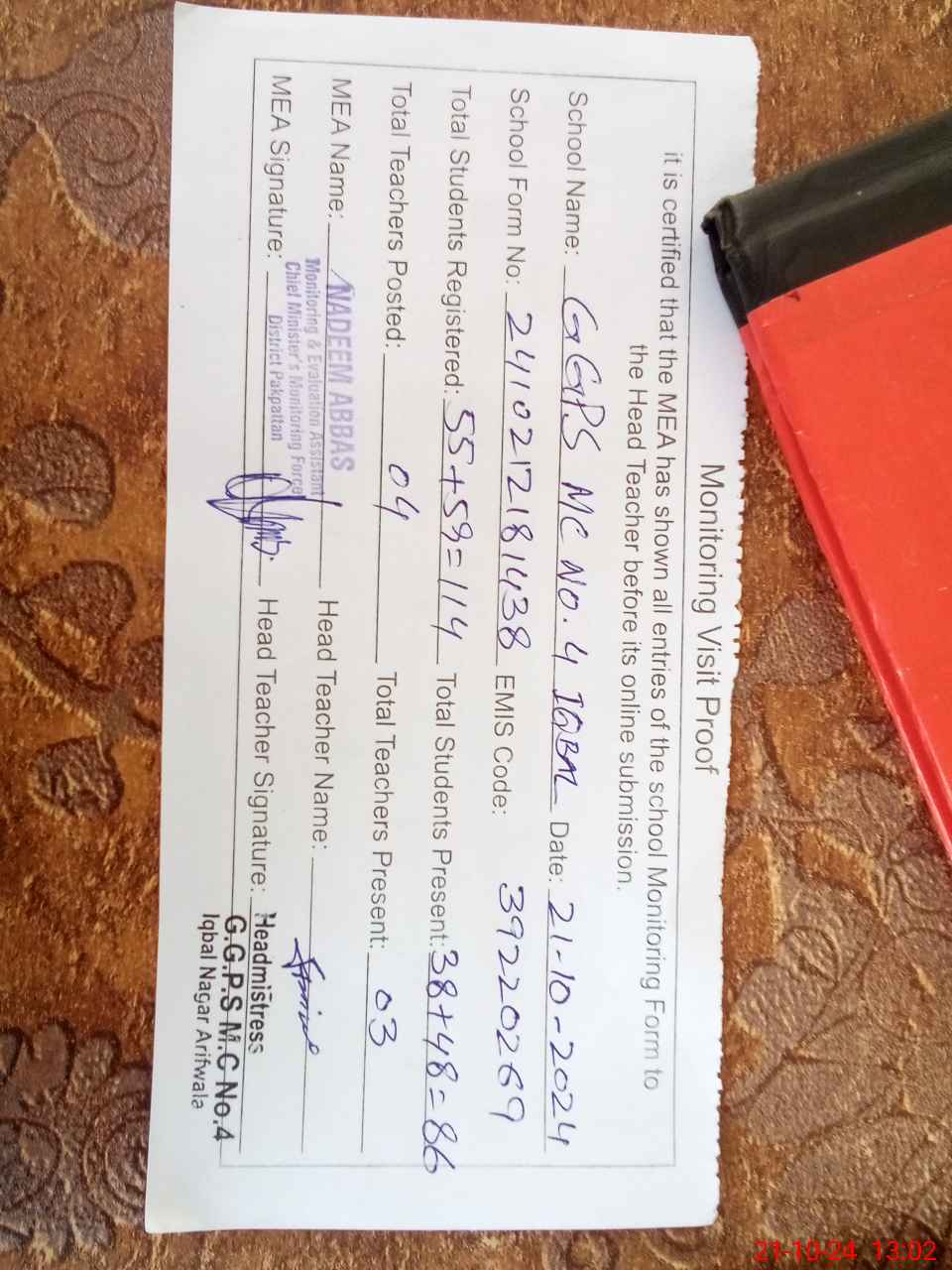 | Attendance Register | Head Teacher | MEA with School | Visit Proof |
