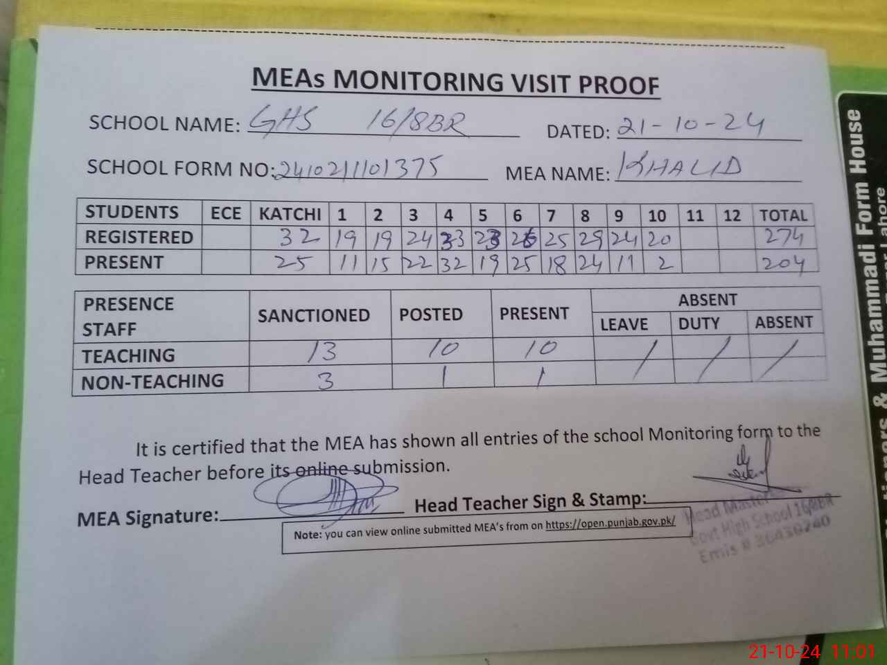 | Attendance Register | Head Teacher | MEA with School | Visit Proof |