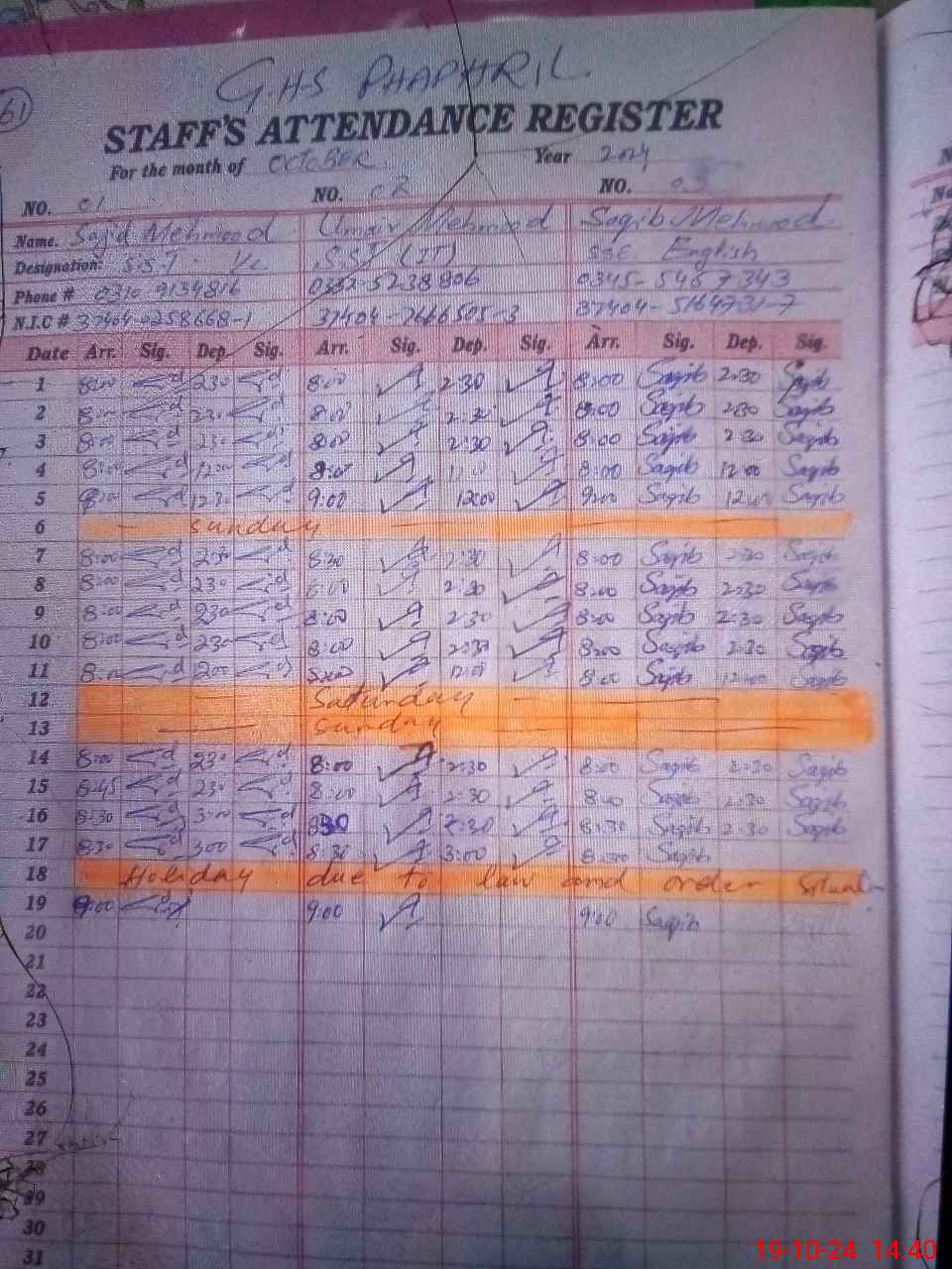 | CNIC | Full Name | Designation | R/C | Absence during last cal. month |
