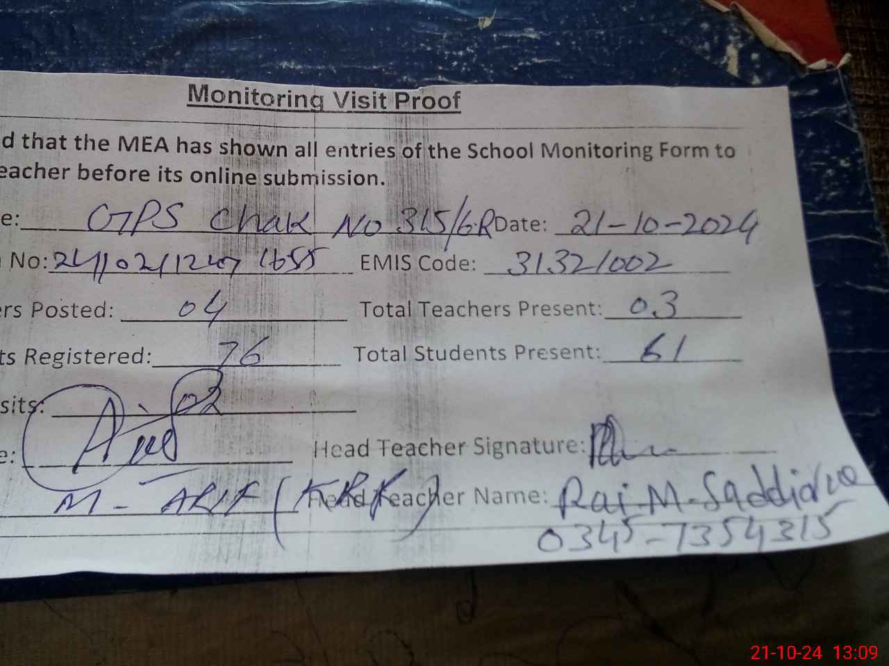 | Name: MU**** SA**** Designation: (School Headmaster's/Headmistress's) PST Phone/Cell Number: 03**** |