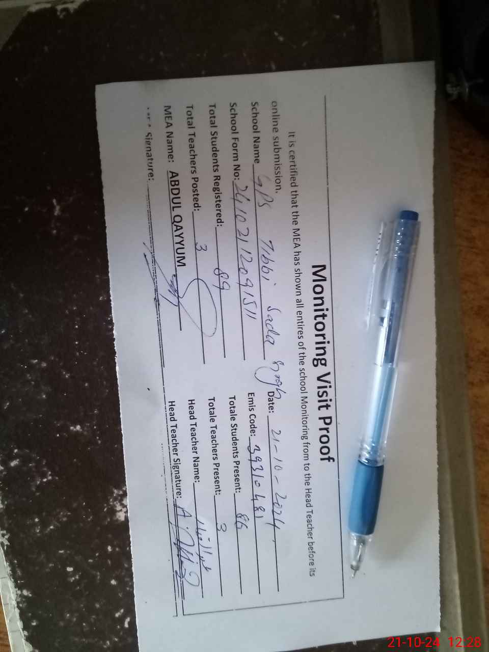 | Attendance Register | Head Teacher | MEA with School | Visit Proof |