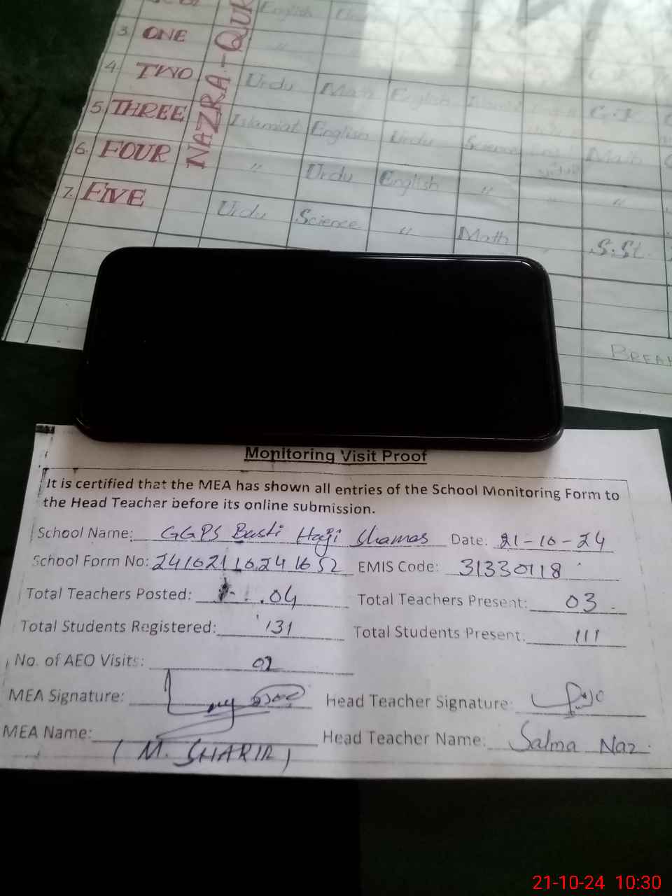 | Attendance Register | Head Teacher | MEA with School | Visit Proof |